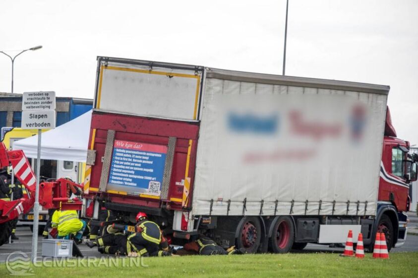 Bij hun aankomst op de parkeerplaats bij poort 3 bleek een persoon bekneld te zitten onder de vrachtwagen. Met een verreiker en hefkussens kon men het slachtoffer bevrijdden waarna deze door ambulancepersoneel en een trauma-arts is onderzocht. Even later is het slachtoffer per ambulance overgebracht naar het UMC Groningen. Hoe het ongeluk heeft kunnen gebeuren is nog onduidelijk, hier zal door de politie onderzoek naar worden gedaan.