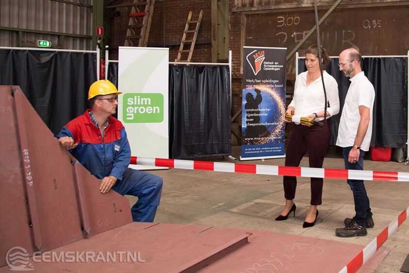 Delfzijl – Op vrijdag 8 juni is de kiel gelegd van het nieuwe, volledig elektrisch aangedreven inspectieschip van de provincie Groningen. Hiermee is de bouw officieel gestart. Deze officiële handeling werd uitgevoerd op de scheepswerf Koninklijke Niestern Sander B.V. door gedeputeerde Fleur Gräper-van Koolwijk.