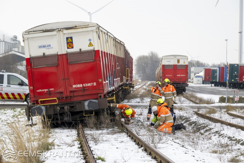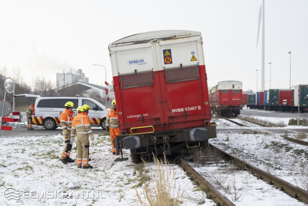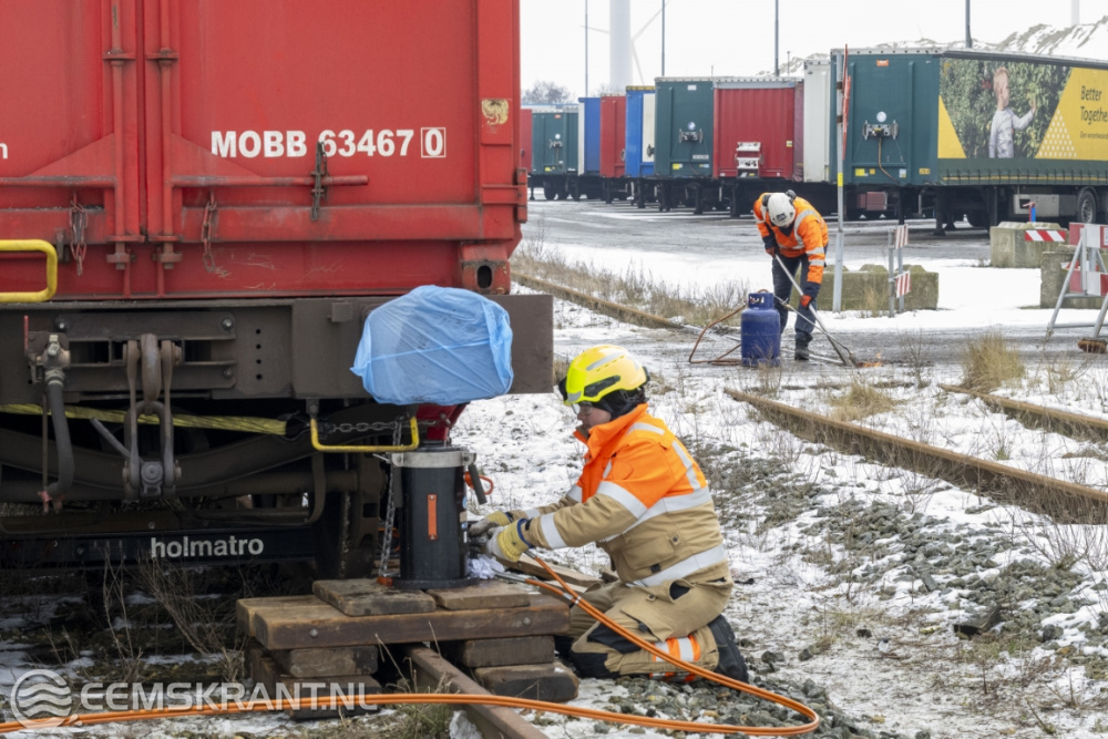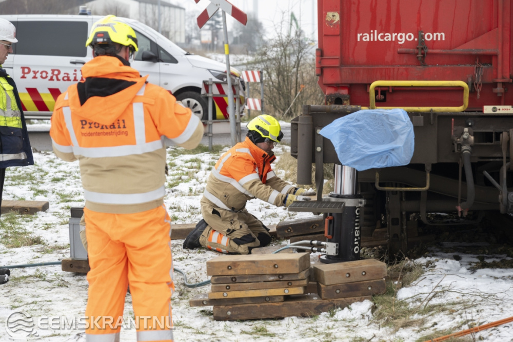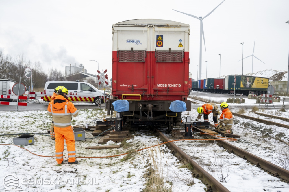 Farmsum – Medewerkers van ProRail en Deutsche Bahn slaagden er zaterdagochtend in om op het Metaalpark in Farmsum een ontspoorde goederenwagon weer op de rails te zetten. De herstelwerkzaamheden begonnen rond tien uur en waren rond half twee voltooid. Het proces omvatte het optillen en zijwaarts verplaatsen van de ontspoorde wagon, gevolgd door het rijden van een goederenlocomotief om de wagon van de spoorwegovergang te verwijderen.