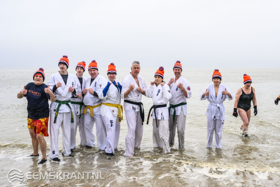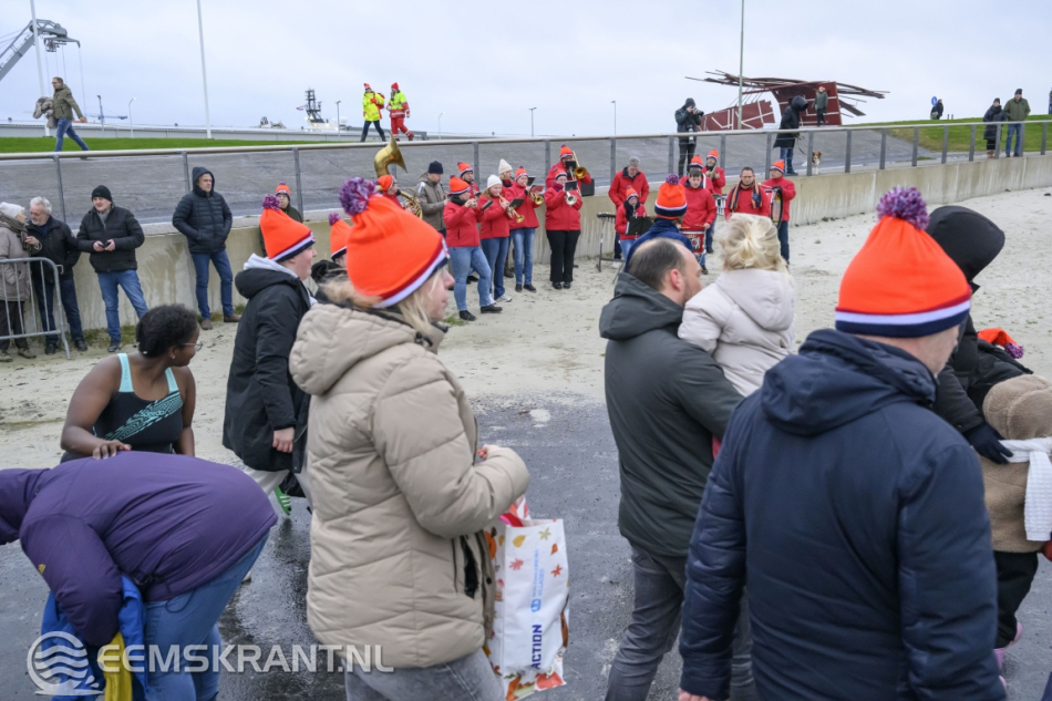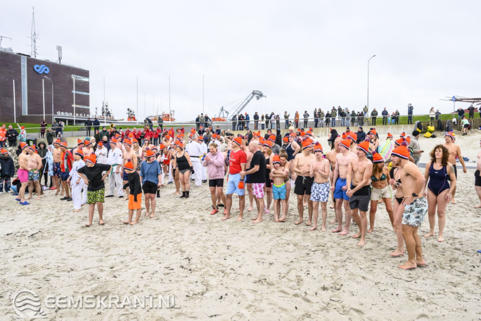 Delfzijl – De nieuwjaarsduik in Delfzijl trok donderdagochtend zo’n 70 deelnemers. Op het strand verzamelden zich de echte bikkels om het nieuwe jaar te beginnen met een frisse duik in de Eems. Fris was het zeker: de buitentemperatuur lag rond de 4 graden, maar door de harde wind en regen voelde het met een gevoelstemperatuur van ongeveer -2 graden een stuk kouder aan.