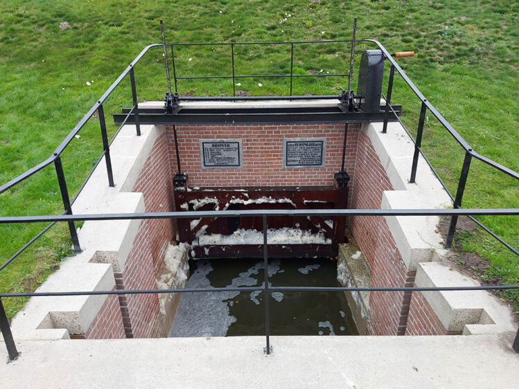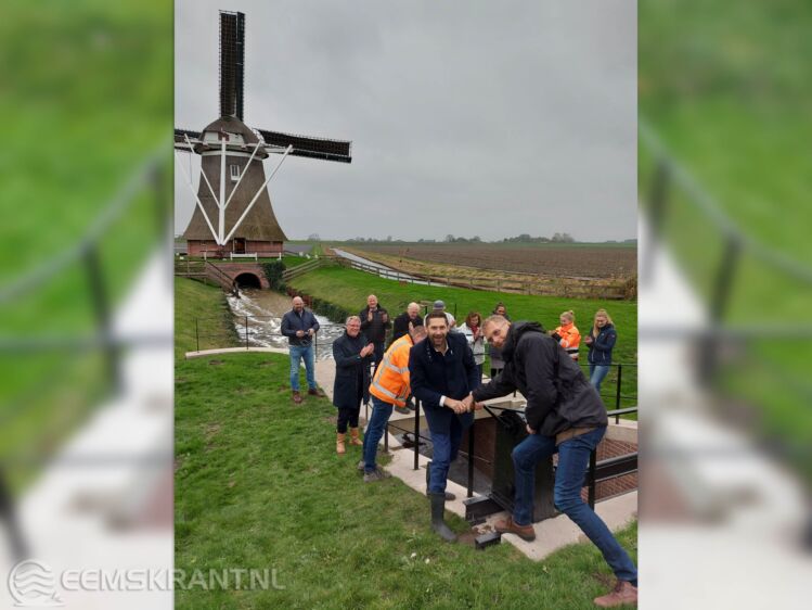 Eemshaven – Met het opdraaien van de schuifdeur in de oude uitwateringssluis bij poldermolen De Goliath nabij de Eemshaven is vandaag de restauratie van deze waterinlaat officieel afgerond. Deze slothandeling is verricht door portefeuillehouder Jeroen Niezen van Waterschap Noorderzijlvest en gedeputeerde Johan Hamster namens Provincie Groningen. Het herstel van dit cultuurhistorisch erfgoed van het waterschap is onderdeel van de uitvoering van het landschapsprogramma ter compensatie van de aanleg van de nieuwe hoogspanningslijn 380 kilovolt. TenneT neemt de verbinding volgend jaar zomer in gebruik.