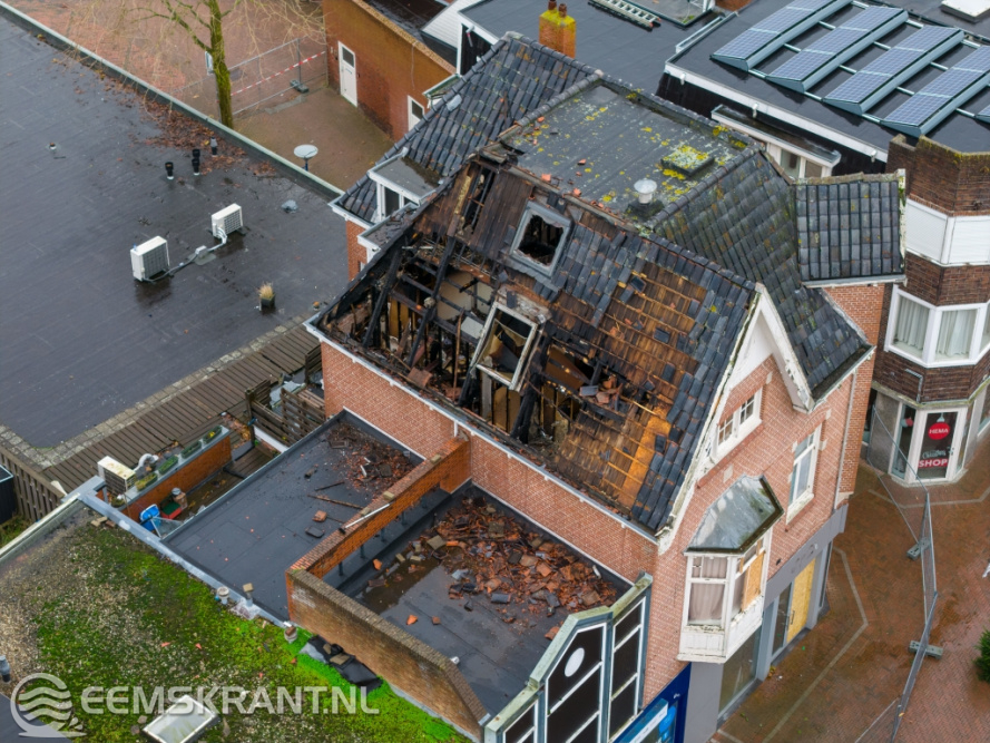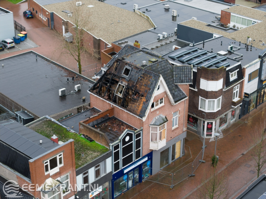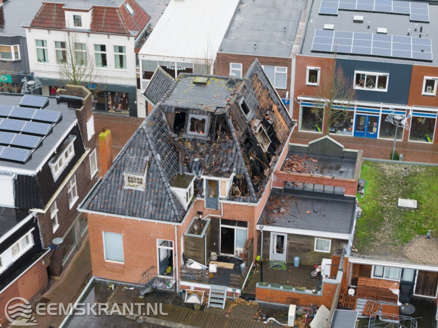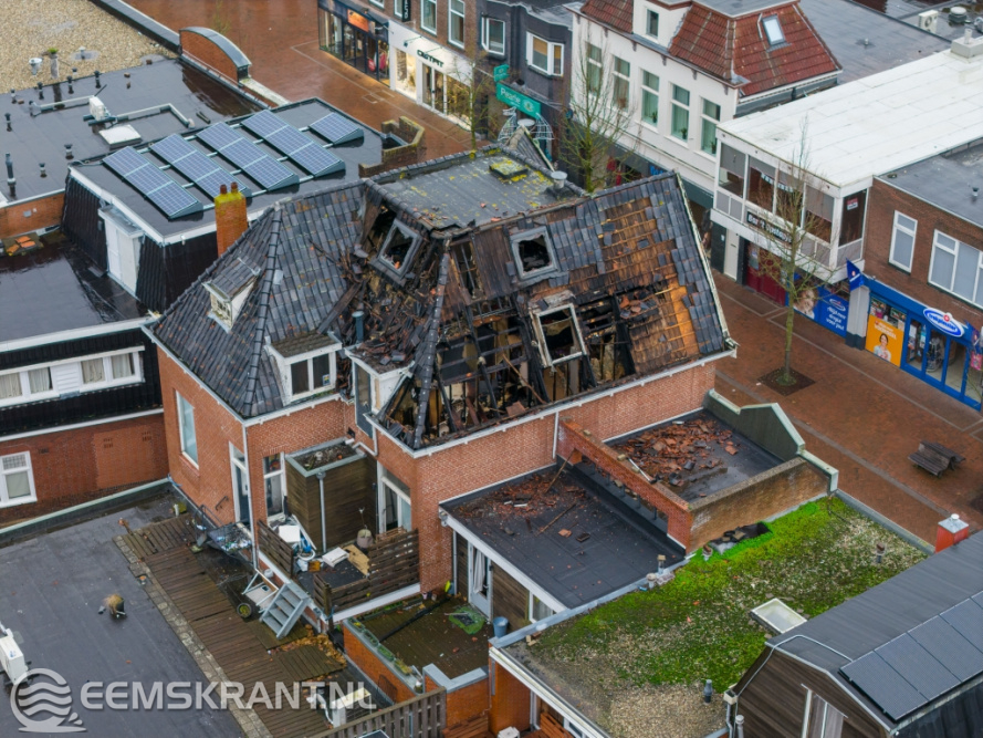 Schade na grote brand in historisch pand Landstraat Delfzijl bij daglicht goed zichtbaar