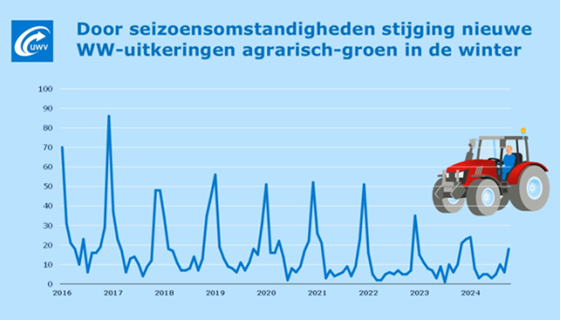 De hoeveelheid werk in de agrarische en groene sector wisselt per seizoen. In de zomermaanden is er relatief veel werk en daalt de WW-instroom. Van oktober tot en met januari is er minder werk en stijgt het aantal nieuwe WW-uitkeringen. In de agrarische en groene sector geldt dit vooral voor productiemedewerkers, seizoenskrachten, medewerkers bloemen- en plantenkwekerij, medewerkers groentekwekerij en medewerkers hoveniersbedrijf en groenonderhoud.