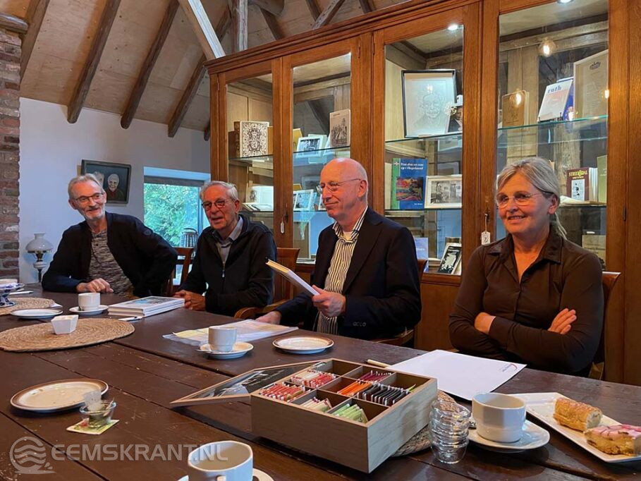 Stedum – Sinds vrijdag 25 oktober is de Stichting Sien Jensema in Stedum een feit. In de oprichtingsbijeenkomst in boerderij Niehof ondertekenden Siewert Jensema, Peter Slager (namens de Stichting Historie Stedum) en Ineke van Zanten de statuten. Dit gebeurde in aanwezigheid van onder anderen notaris H. Huitsing, wethouder Pier Prins (gemeente Eemsdelta) en streektaalconsulent Fieke Gosselaar. Met de oprichting van deze stichting is nu een formele stap gezet in het bewaren en borgen van boeken, kunstwerken en andere objecten die zijn voortgekomen tijdens het werk en het leven van Sien Jensema.