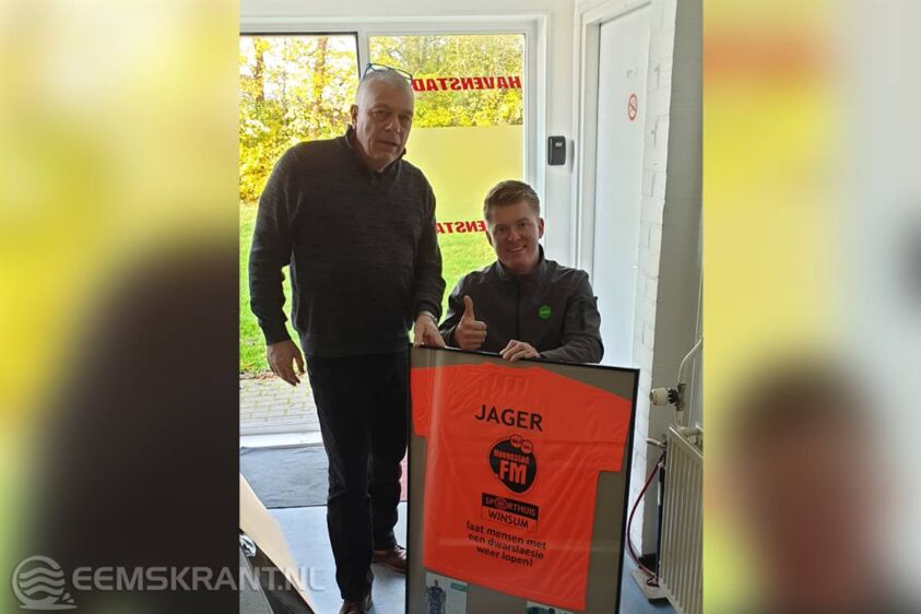 Delfzijl – Lokale Omroep Havenstad FM werd afgelopen week plots verrast met een bezoek van Dennie Jager van de Stichting Walk On. Hij bracht een ingelijst lopers T shirt mee voor de omroep als dank voor het bescheiden sponsoren met T-shirts voor hem en zijn team tijdens de 4 Mijl van Groningen.