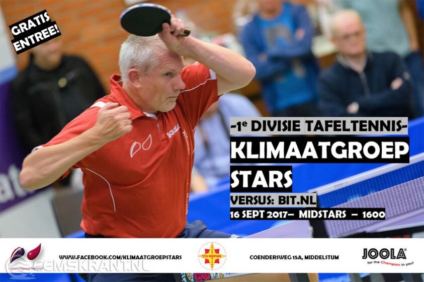 Middelstum – Zaterdag 16 september speelt het tafeltennisteam Klimaatgroep Stars uit Middelstum een thuiswedstrijd tegen Bit.nl uit Ede. Na twee prachtige jaren in de Eredivisie, nu een stapje terug met een nieuwe team uitkomend in de 1e Divisie.