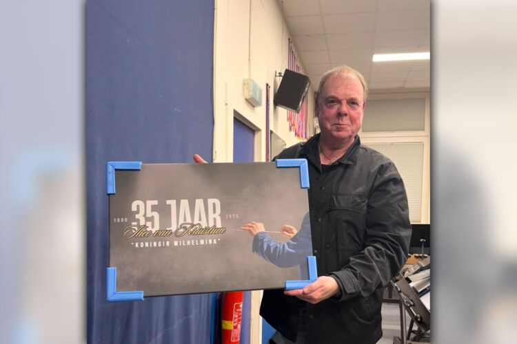 Delfzijl – Afgelopen vrijdag vierde muziekvereniging “Koningin Wilhelmina” het 35-jarig jubileum van Theo van Kruistum als dirigent van het slagwerkorkest. Al sinds 1990 dirigeert Theo van Kruistum op bezielende wijze het Slagwerkorkest op het hoogste niveau van Nederland. Onder zijn leiding werd het Slagwerkorkest veelvoudig Nederlands Kampioen en werden gouden medailles gewonnen op het Wereld Muziek Concours.