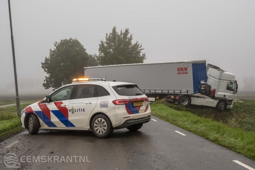 De vrachtwagen hangt deels boven een sloot en moet door en bergingsbedrijf worden geborgen. Hoelang de stremming nog gaat duren is niet bekend.