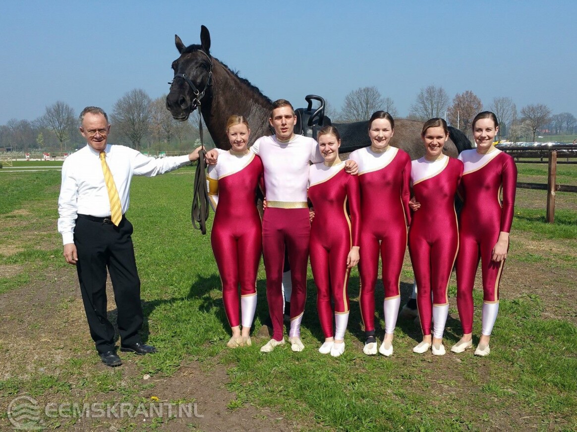 Vragender – Het eerste NK en winstpunt is binnen voor het Z-team van de voltigevereniging De Eemsrakkers uit Holwierde. Het team behaalde in Vragender (gemeente Lichtenvoorde) een mooi eindcijfer van 6.435. Voor de 1e keer liet het team, bestaande uit de voltigeurs: Klaudia Arends, Marie Christine Spraakman, Fleur Medema, Rienke Feitsma, Caston ten Hove, Silke Spijk (en Esmee Groeneveld), onder leiding van Martin Hamminga op paard Hero de prachtige kur met het thema Madagascar zien!