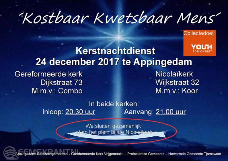 Appingedam – Voor het derde jaar op rij houden vier kerken in Appingedam samen kerstnachtdiensten. In 2015 was de Gereformeerde Kerk aan de Dijkstraat te klein voor de toestroom; vorig jaar hebben de kerken twee achter elkaar gehouden.