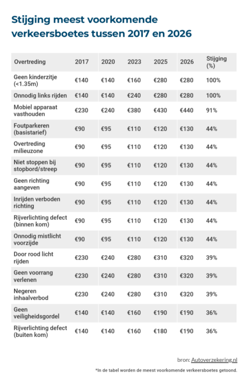 Welke boetes zijn het meest gestegen tussen 2017 en 2026?