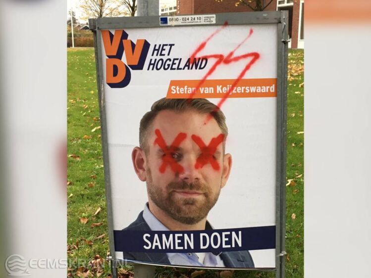 Uithuizen – De VVD het Hogeland heeft geschokt gereageerd op de bekladding van de verkiezingsposters en het kapot snijden van de spandoeken in en rond Uithuizen. Sommige posters zijn met echt foute tekens besmeurd. Lijsttrekker Stefan van Keijzerswaard: “Ik ben helemaal ontdaan. Ik had niet verwacht dat dit zo’n impact zou hebben. Maar we hebben vooralsnog alle campagne-activiteiten in dit gebied opgeschort.”