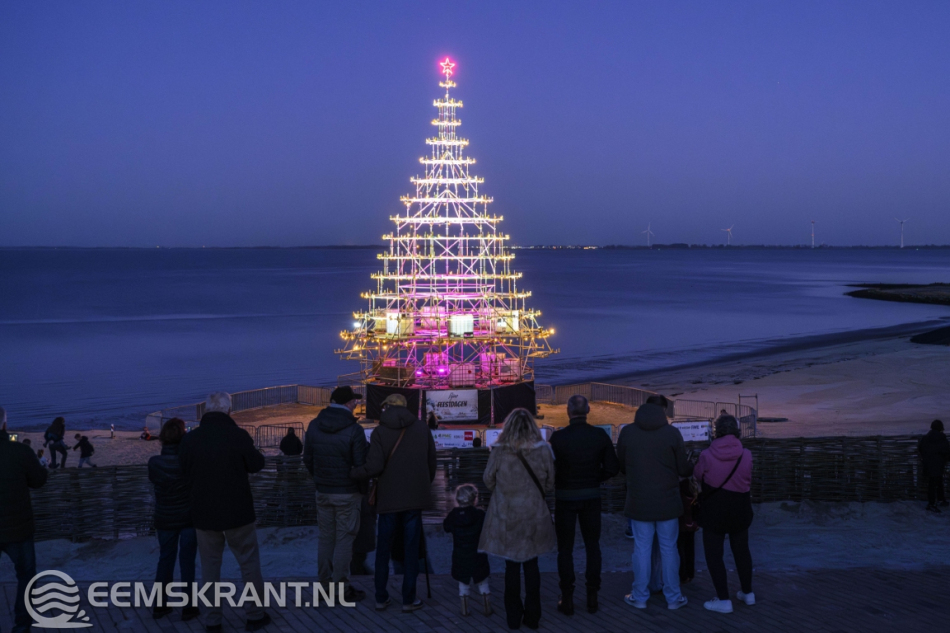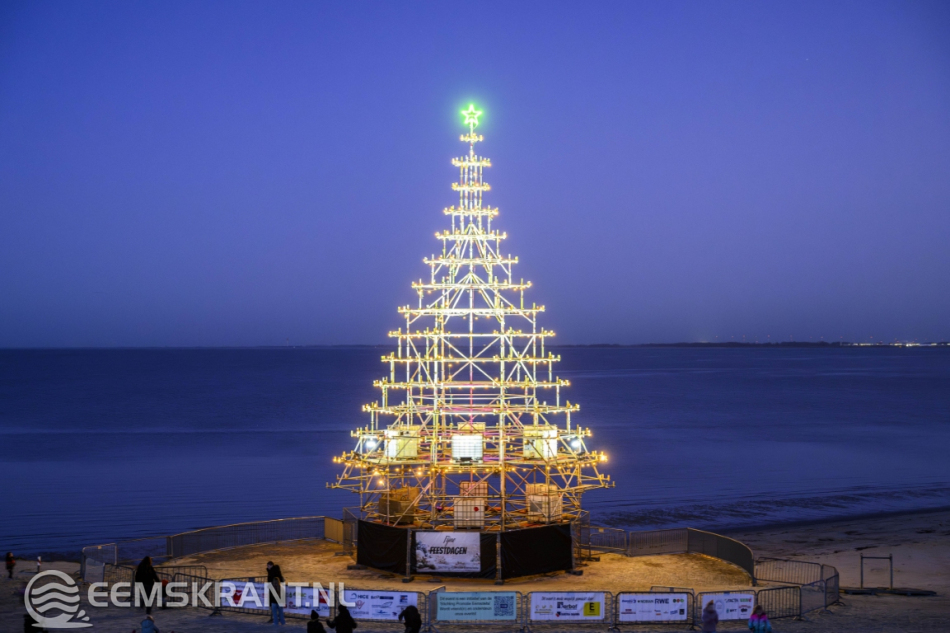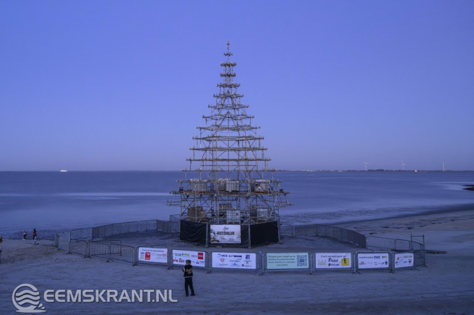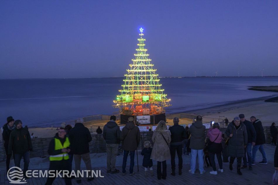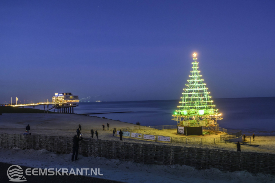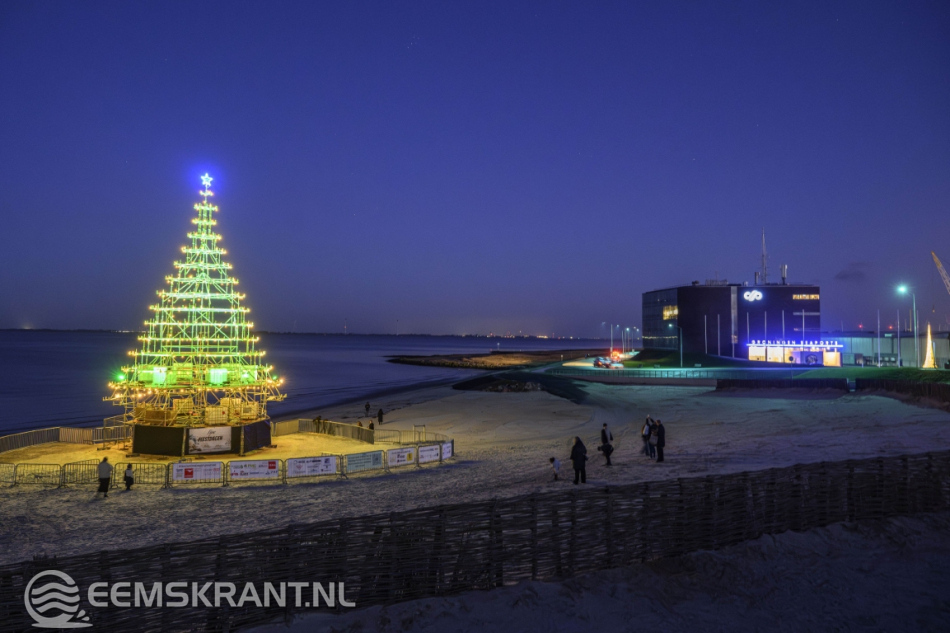 Delfzijl – Aansluitend op de ontvangst van de Kerstman in Delfzijl is zaterdag op het stadsstrand de verlichting ontstoken van wat volgens de organisatie de grootste en meest bijzondere kerstboom van de provincie Groningen is. De constructie, volledig opgebouwd uit steigers, heeft een hoogte van circa 25 meter en vormt een opvallende blikvanger aan de Eems.