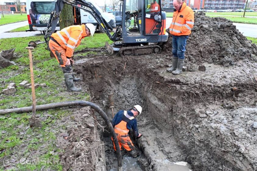 Delfzijl – Door een lekkage in een waterleiding aan de Hogelandsterweg in Delfzijl zitten huishoudens in de omgeving zonder water. Waterbedrijf Groningen heeft de locatie van het lek gevonden en met een graafmachine de grond weggehaald. Het blijkt te gaan om een koppeling die versleten is. Er wordt zo snel mogelijk een nieuwe koppeling geplaatst, de duur van de herstelwerkzaamheden is nog niet bekend.