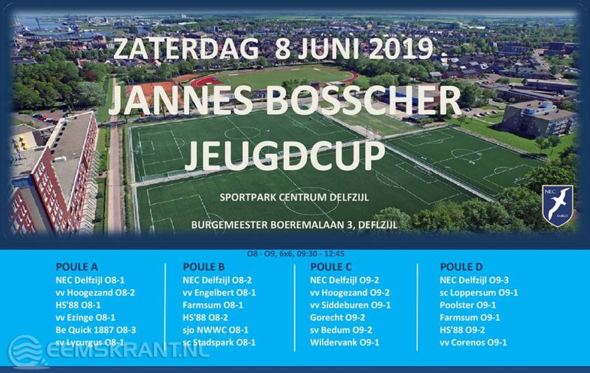 We zijn tevens trots te melden dat de Jeugdcup is vernoemd naar Jannes Bosscher. Om Jannes Bosscher te eren en zo vanuit de club onze dankbaarheid te tonen voor wat hij voor onze club heeft gedaan. Hij is 5 jaar terug overleden, vlak voor de formele fusie van onze club. Als oud-voorzitter heeft Jannes veel betekend voor toenmalig Eems Boys. Hij heeft zich sterk gemaakt voor de fusie van Neptunia en Eems Boys tot NEC Delfzijl en heeft deze fusie mede vorm gegeven.