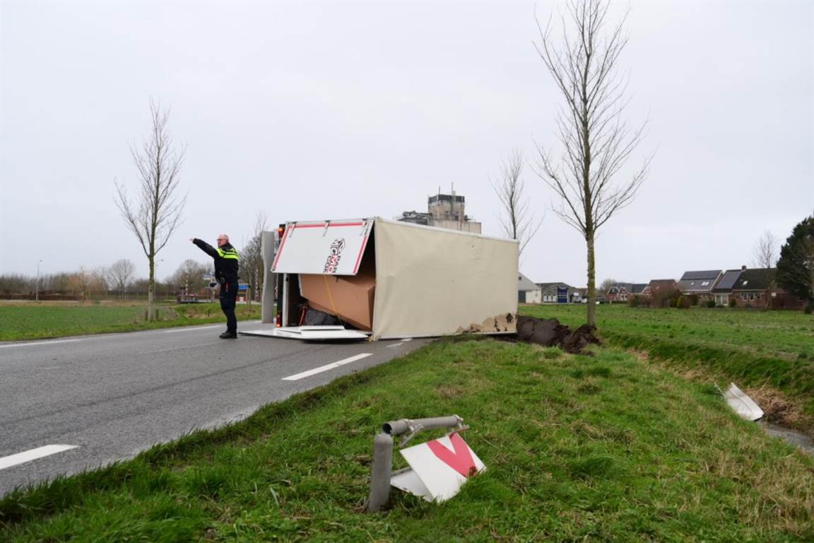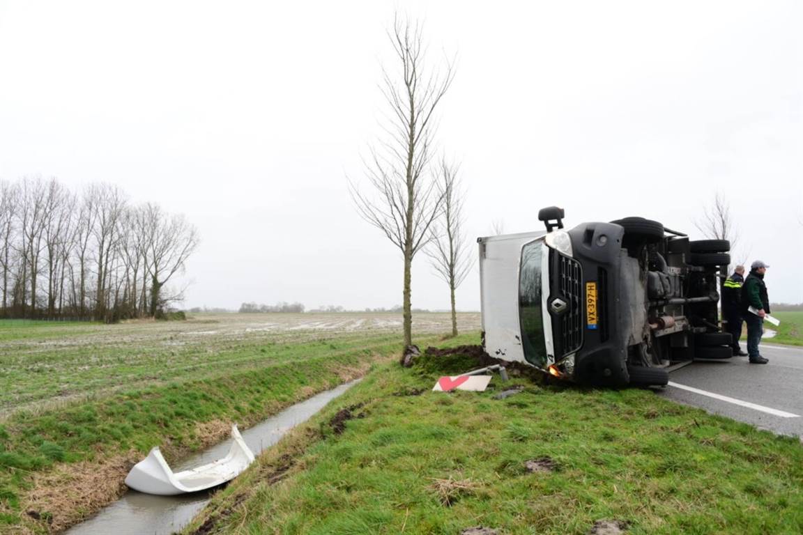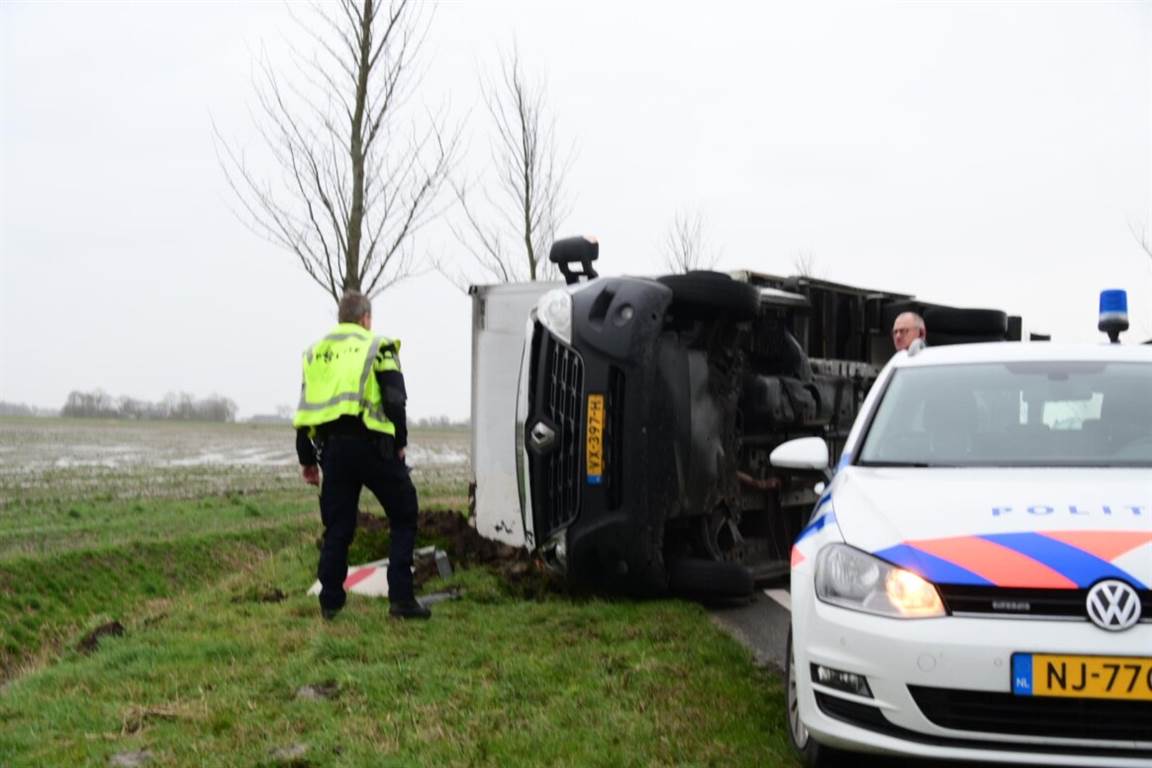 Een windvlaag kreeg vat op kleine vrachtwagen en wierp deze op zijn kant. De chauffeur bleef ongedeerd en kon zelfstandig uit zijn cabine klimmen. De opgeroepen brandweer werd afgemeld.