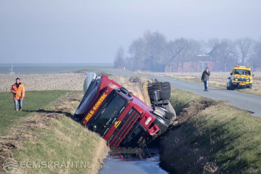 Uithuizen – Een vrachtwagen is in de nacht van maandag op dinsdag langs de Eemsweg bij Uithuizen in de sloot beland. De chauffeur liep geen letsel op.
