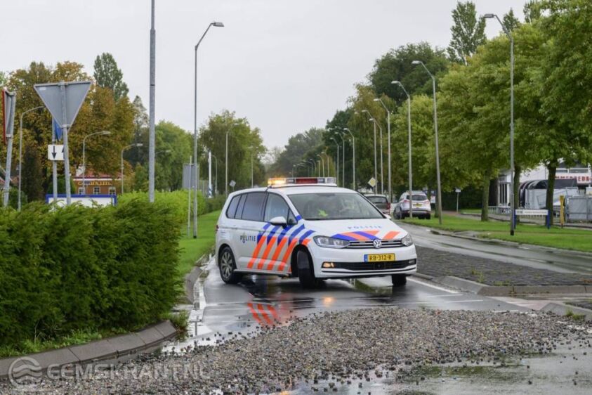 Op de rotonde met de Houtweg verloor de chauffeur een deel van zijn lading afvalpulp. Hoe dit kon gebeuren is niet bekend.
