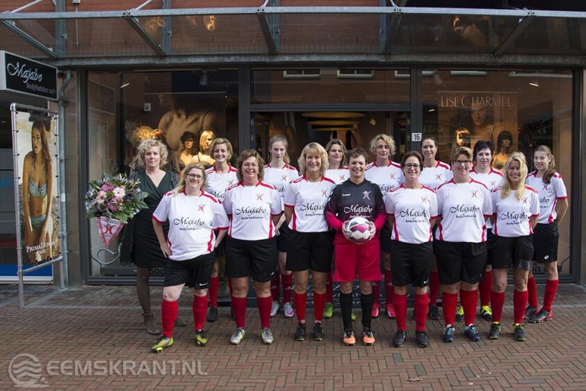 Delfzijl – Majabo Bodyfashion is shirt sponsor geworden van de dames van VV Holwierde 2. Zaterdag presenteerde het team zich voor de winkel van Magreet Bolt in hun nieuwe tenue.