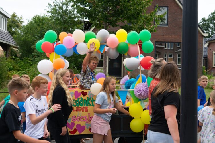 ’t Zandt – Juf Geesje is op haar laatste officiële werkdag op OBS De Zandplaat in ’t Zandt de school uit geduwd door alle leerlingen. Daarna zijn juf en de kinderen in optocht door een deel van het dorp gereden.