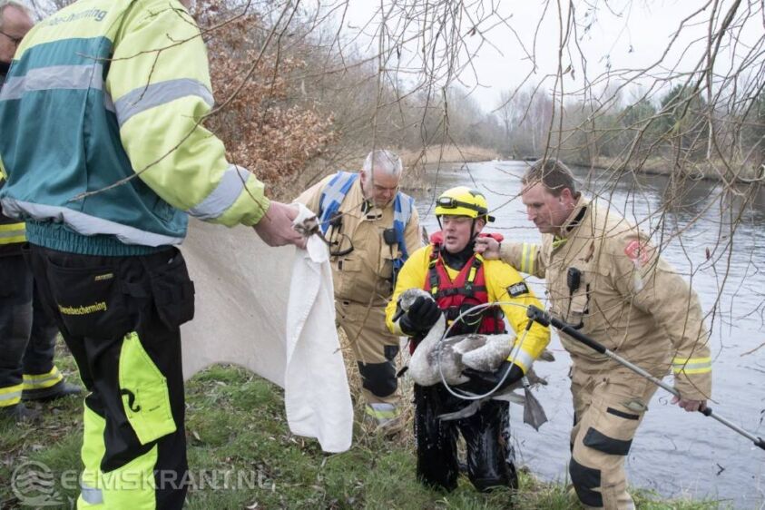 Daarom werd het oppervlakte reddingsteam (ORT) van brandweer Delfzijl ook opgeroepen. Twee zwemmers van het ORT wisten de zwaan te pakken te krijgen waarna het visdraad verwijderd kon worden. De zwaan kon daarna meteen weer worden teruggezet in het water.